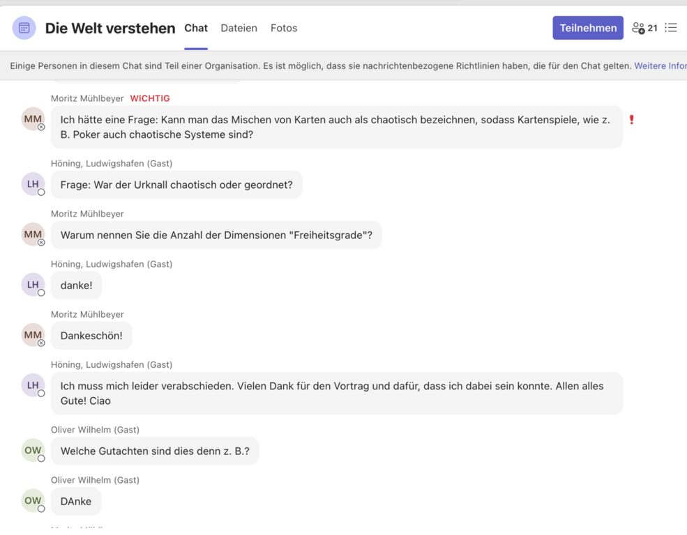 On 18.11.2025 leader of the University of Parma team Prof. Johannes Hecker Denschlag had a presentation on ‘Chaos and Dynamics’ (in German) - ‘Die Welt verstehen: CHAOS – THEORIE ODER WIRKLICHKEIT?’ at an event for a general audience organised by the foundation Stiftung Pfalzmetall. The talk was online with the presence of about 20 high-school and evening (adults) students guests